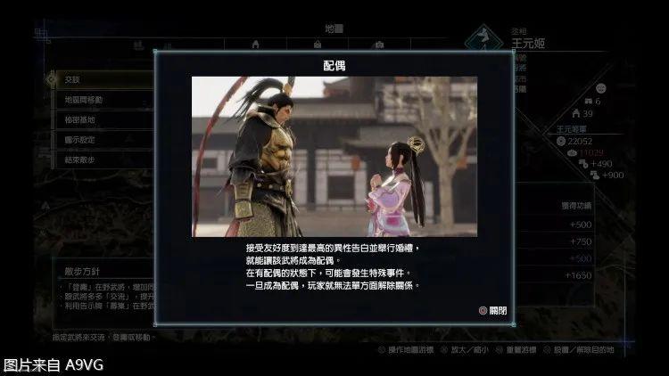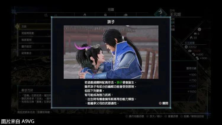 结婚系统也算是比较略有意思的一个环节,与各武将友好度从低到高依次为E D C B A S(100为满值),S后可以达异性告白或者结义(限3人)。争霸模式通关后,若结婚对象存活,则会有子女诞生的剧情,且会以特殊新武将选择登录,同时这个也涉及了游戏的3个奖杯。