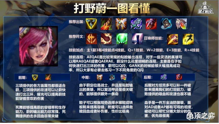 蔚的出装相对来说还是比较灵活的,最重要的无非就是三项和复活甲,一件是主要的输出来源,一件是提高容错和生存能力,其他的装备都可以根据局势调整,如果对方坦克真的多就可以出破败了,脆皮多可以死舞和血手,死舞主要是针对物伤,血手则不管面对物伤还是法伤都有很不错的效果。不出破败的时候也可以出兰顿、自然之力或者反甲这种防御装,用来刻意的去针对敌方最高的伤害。