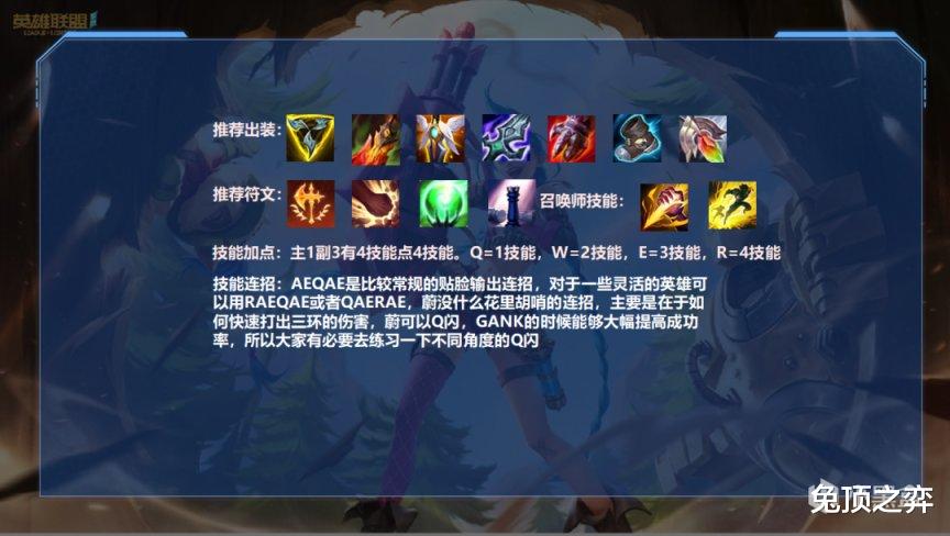 AEQAE是比较常规的贴脸输出连招,对于一些灵活的英雄可以用RAEQAE或者QAERAE,蔚没什么花里胡哨的连招,主要是在于如何快速打出三环的伤害,蔚可以Q闪,GANK的时候能够大幅提高成功率,所以大家有必要去练习一下不同角度的Q闪