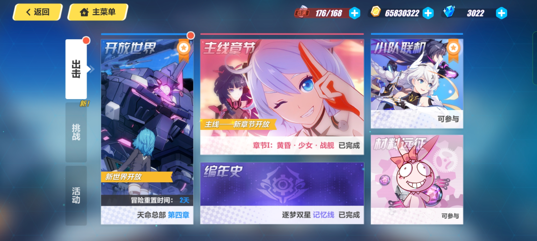 这里包括出击、挑战以及活动,现在我们点击出击一栏可以看到,有开放世界、主线章节、编年史、小队联机以及材料远征。挑战一栏可以看到,有超炫空间、记忆战场、万象虚镜以及往世乐土活动一栏主要是战术课堂、角色试玩、崩坏拯救日志、封锁地带以及模拟作战室2、女武神