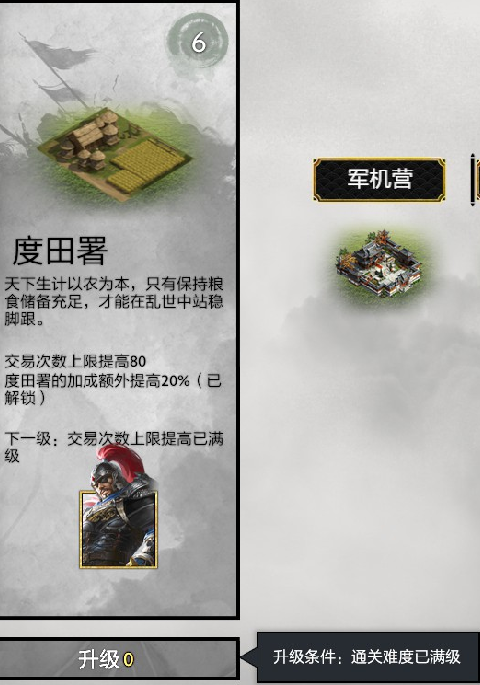 这四个隐藏成就获得的难点主要在于度田署的等级,赌怪和把酒临风还好,只需要升级几级度田署即可,而宰猪和发家致富则需要将度田署升级到满级并入住一名武将后才能完成。