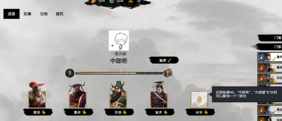 首先是个人经验,个人经验可以在部曲——派系中提升我们的官职,官职的提升不但可以让我们获得各种奖励,还可以解锁门客位,最高可以提升10级。
