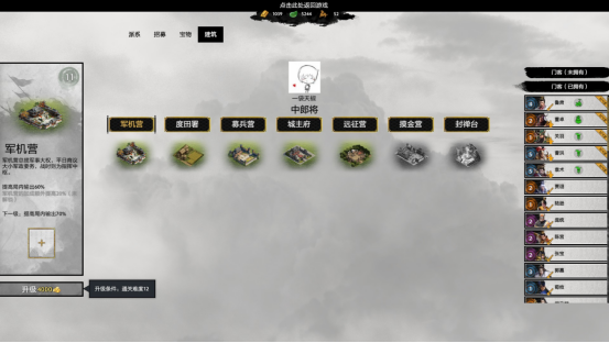 各个建筑的升级需要消耗金砖,并且有相应的难度要求。每个建筑都可以任命一个符合要求的五星门客解锁额外效果。