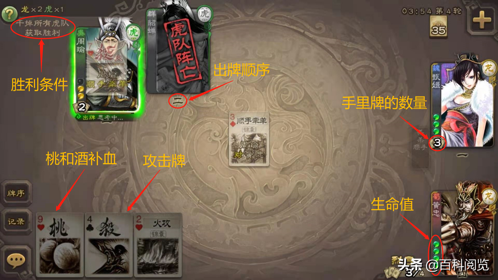 在界面的左上角是这局胜利的条件,界面上的四张卡牌代表着四个玩家选的武将。