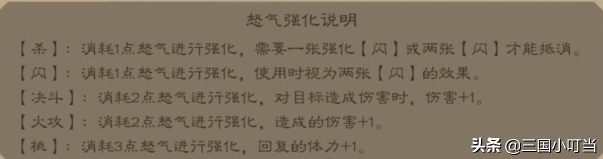 怒气的作用有以下几点:对别人造成伤害或令其失去体力后,消耗一个怒气看一下受伤角色是敌是友;强化手牌,这个后面再说。