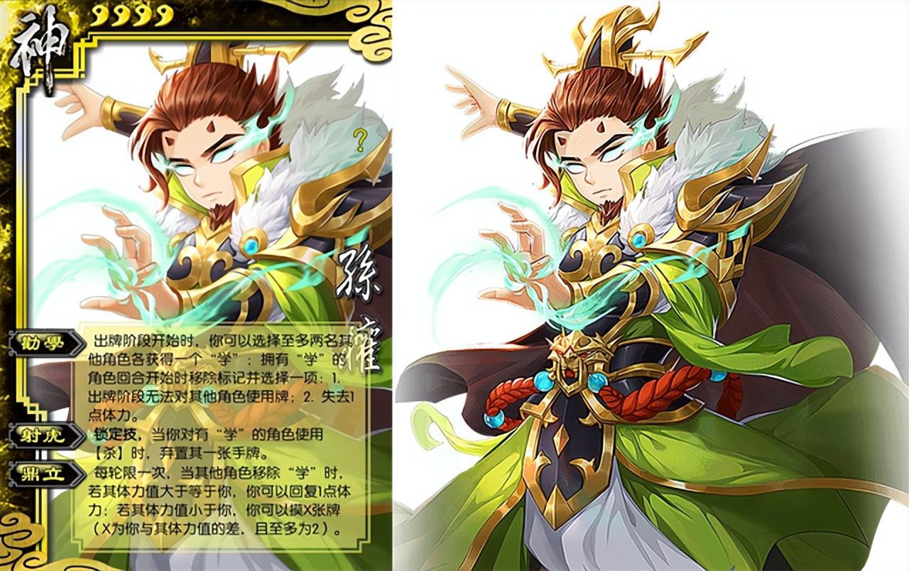 根据上面两点,并且结合目前已经公布的新神将势力信息,小编大胆推论,本次成神的两名武将中,至少有一名是张飞或者孙权。巧合的是,其实三国杀早就已经出过神孙权了,也就是年初在欢乐三国杀中率先登录的版本。拥有技能“劝学”、“射虎”以及“鼎立”。简单来说,这名神将是可以“劝”别人去当吕蒙的,属于弱控制型武将。