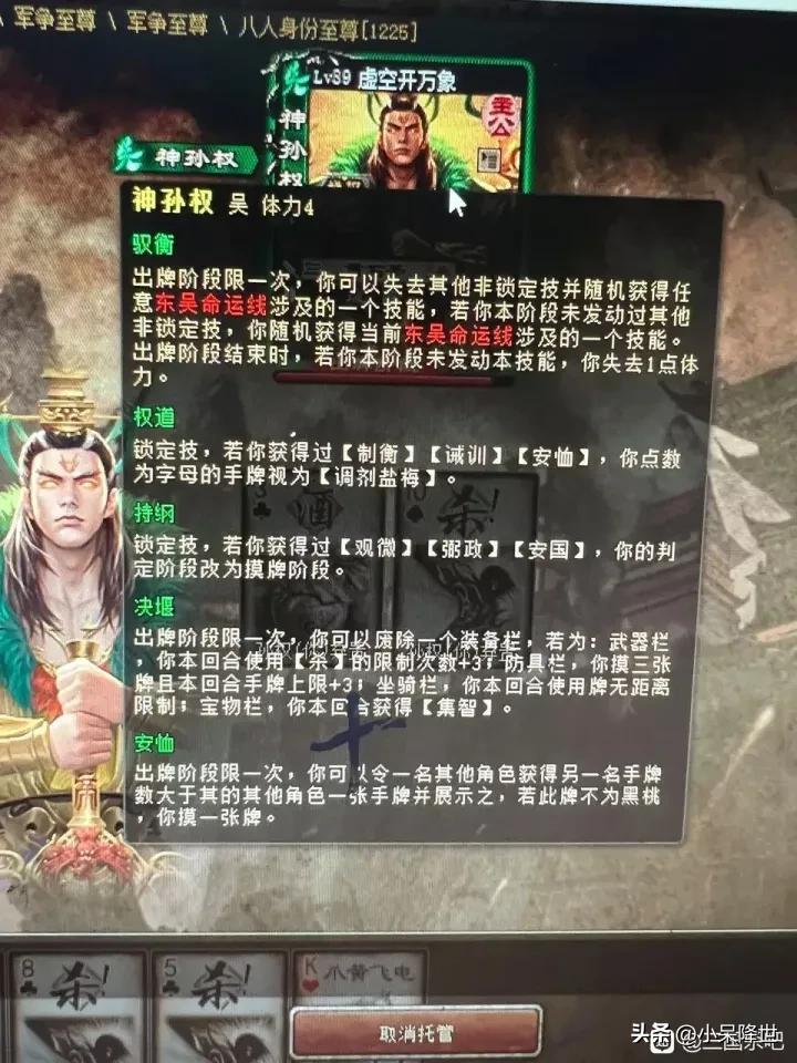 而神孙权不仅占据了上面所说的全部缺陷,还有个更致命的问题,就是这个武将的技能描述不只是1张牌写不下,5张牌都写不下……