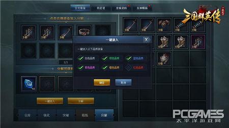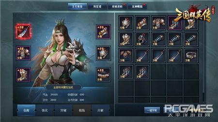 仓库用来安放主公多余的装备,主公将低级装备替换成高级装备后,装备就会落入仓库里。主公们也可以选择“一键穿戴”以及“一键卸下”来实现装备的更换与提升。