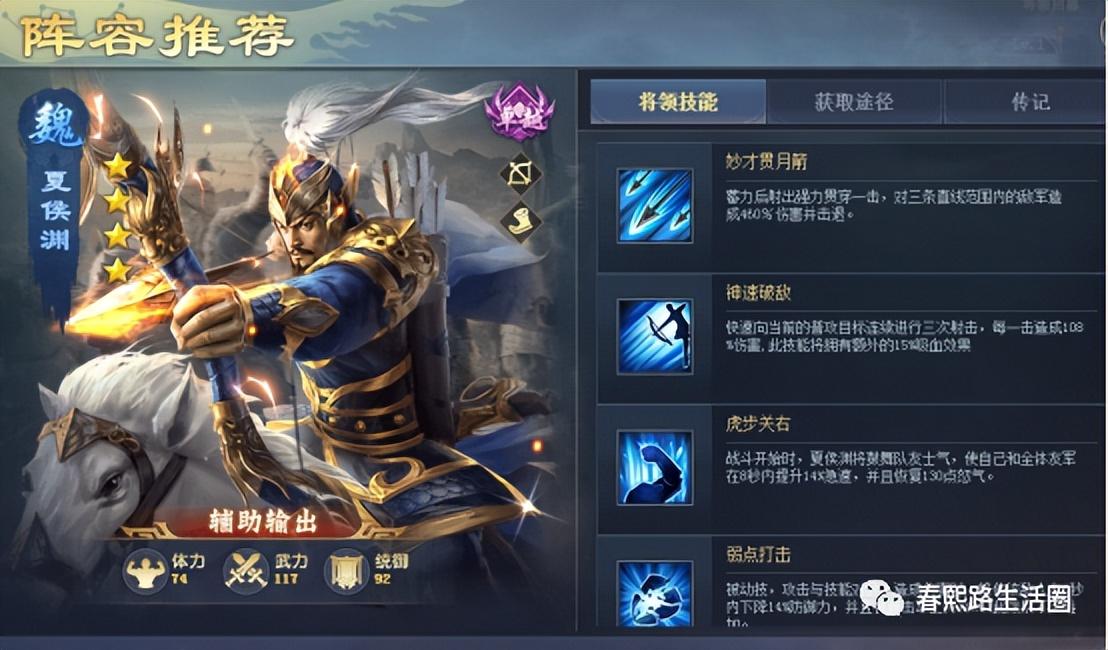 夏侯渊怒气技可输出可击退,【虎步关右】还可以给队友增加急速增益效果;同时【弱点打击】能削弱敌军防御和抗暴。夏侯渊可获得城池拜会:荆州城、城池拜会:上党、名将阁、将星商店、云台拜将获得。