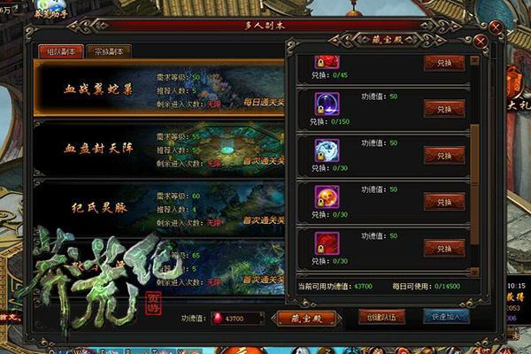 玩家挑战组队副本后,可积攒一定的功德值,功德值可于藏宝殿界面中兑换一气水元珠等道具奖励,每一个一气水元珠需要消耗50功德值,每日最多可兑换30个。