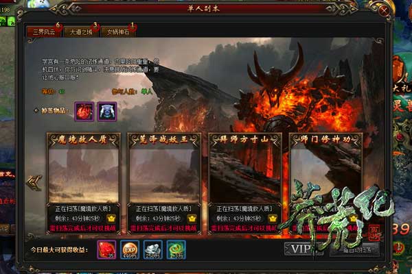三界风云:单人副本中三界风云内部有许多关卡,玩家的等级越高可以挑战的关卡越多,这些关卡会掉落装备资源,通关关卡还可以获得元液、银两和大量经验奖励。