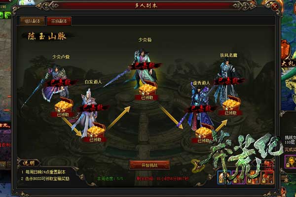 宗族副本:加入宗族的玩家即可享有宗族副本的奖励,宗族副本内部有多个关卡宗族成员完成击杀,所有宗族成员都可以领取宝箱奖励。宗族副本的奖励包括经验、强化材料、珍宝殿材料和宗族令牌。