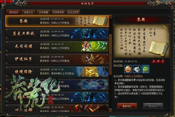 答题:等级达到50级的玩家每日都可参与答题活动,在活动中每答对一道题,都可累计积分、经验和元液,答题速度越快,获得的积分就越多。在活动结束时积分排名前20的玩家还将获得额外大礼。