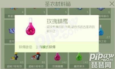 玫瑰精露是一款基础的圣衣升级材料 。这款材料在生存模式中的掉落概率还是很高的。和精灵泉水、超能7号电池一样,是掉落概率最高的材料。小伙伴们只要生存模式最后获胜了,都是有很大的概率可以获得玫瑰精露的哟,所以想要获得玫瑰精露的话,那就必须要去玩生存模式~一天可以玩三次~
