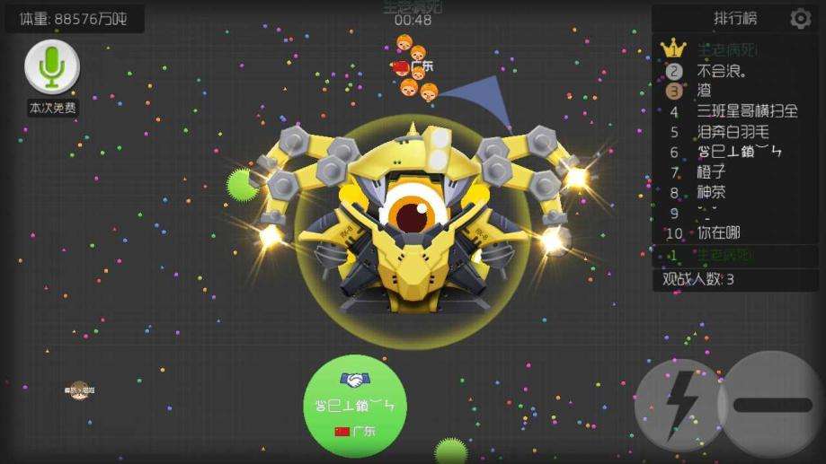 分身之后,小伙伴们要学的就是吐球了。吐球是将你刚刚吃进去的那些体重给变成孢子吐出来。再吃下去后你就可以变大。分身为二后,你就从一个大球球变成两个小球球。点击闪电键,就可以吐球球。将其中一个小球里的所有孢子都吐到另外一个小球上,就变成1个小球1个大球。这样比较不容易被人吃掉,而且还可以再分身吃人,小球球还可以充当斥候,先跑到前面去看看有没有比你大的过来了。