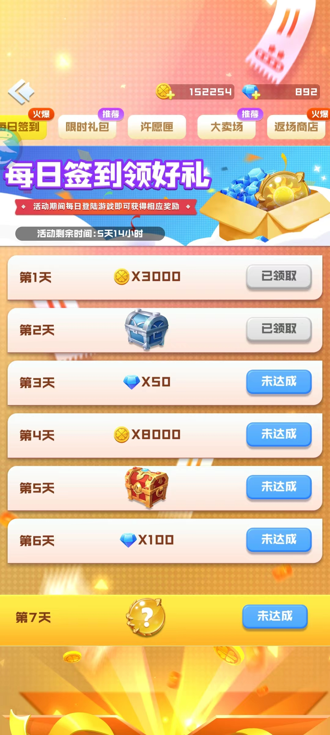每日签到:每天上线登录即可领取奖励,钻石、宝箱,以及第7天登录的随机传说球球。这个没什么好说的,苍蝇腿福利,不过活动也没什么要求每天上线即可领取(不如杰克球球连续7天登录抽奖)