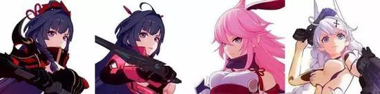 芽衣影舞冲击、脉冲装·绯红、八重樱逆神巫女、琪亚娜白骑士·月光