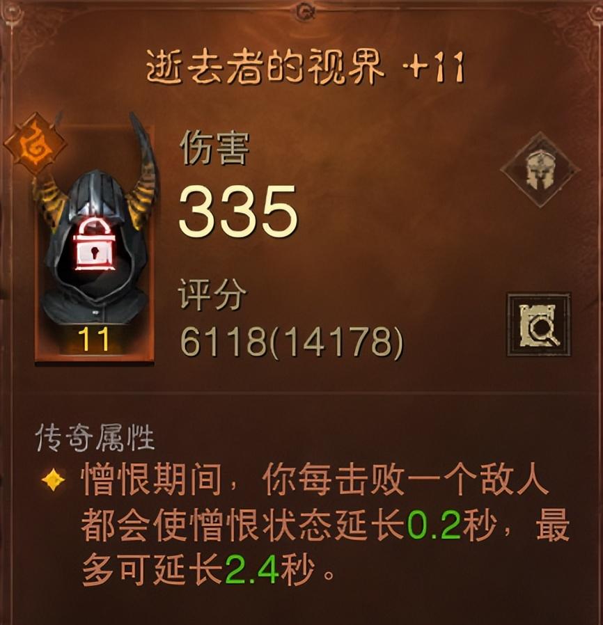 头部则是“逝去者的视界”,增加憎恨的时间,配合增益时间增长的魔法词缀,又肝又氪的玩家能堆到极致无限憎恨,非常霸道。