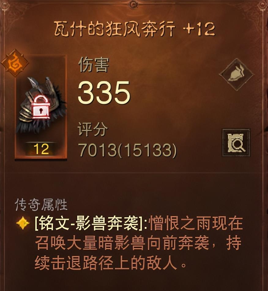 肩膀则是“瓦什的狂风奔行”。他是憎恨之雨的技能特效,改变了特效后持续时间长,范围广,输出也不低,正好可以弥补清怪能力低的短版。