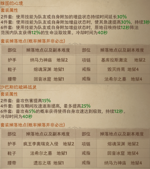 绿色套装上我推荐维图4件,增加憎恨的持续时间和急速。也有人推荐用沙巴斯,但我自身体验下来觉得不如维图4件拉时间爽。并且说实话,攻速上升了也没感觉挡位有上去。