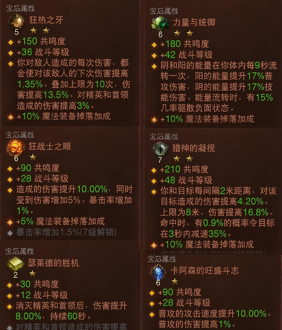 传奇宝石方面推荐一些一二星的,狂热之牙、力量与统御、猎神、狂战士、瑟莱德和卡阿森。有条件的可以上能量之源、斗志翡翠、毒石和阴影回响。