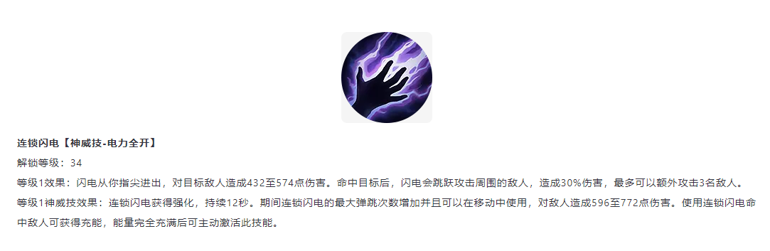 当该技能得到强化之后,会变成电力全开,持续12秒的时间,闪电的弹跳次数也会增加,同时伤害值也会提升近30%。