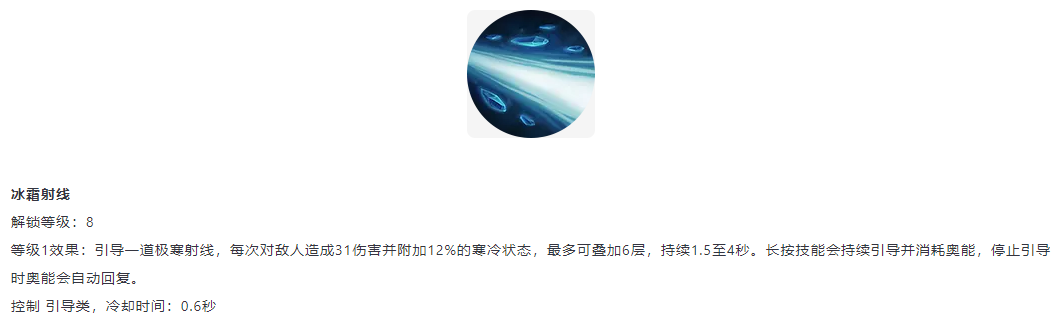 这是一个蓄力技能,伤害跟蓄力的时间有很大的关键,也是法师的一个控制技能,能够对前方的敌人造成高额的法术伤害,并且能够将敌人击退,十分适合跟冰霜射线配合使用。