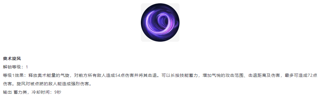 当奥术旋风蓄力的时间越久,那么对敌人造成的伤害值是越高的,击退的距离越是越远的。