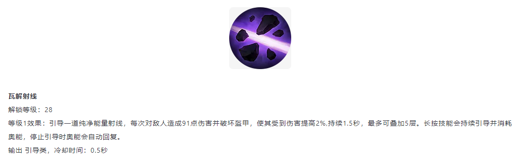 该技能能够对敌人造成伤害的同时,还能够破坏其盔甲,同时还能够提升2%的伤害值,最多能够叠加5层。