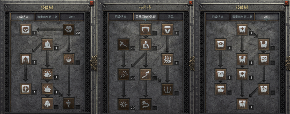 加点也很简单,满四个技能:剧毒新星、骷髅专精、毒爆、淬毒匕首。魔像点到铁魔,再点一级召唤物抗性和一级骷髅专精。诅咒点一级降低抗性,一级迷乱或骨墙来聚牛。输出时用降低抵抗配合剧毒新星制造尸体,而后放伤害加深配合尸爆清怪。