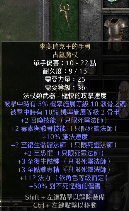 武器方面,首选是破隐,没有的话采用李奥瑞克王的手骨。自带两级召唤和毒骨,各项词缀都非常好,除了被挨打的时候会触发骨牢。虽说不至于毁掉这把武器,但自求多福吧,老玩家没少被它坑过。