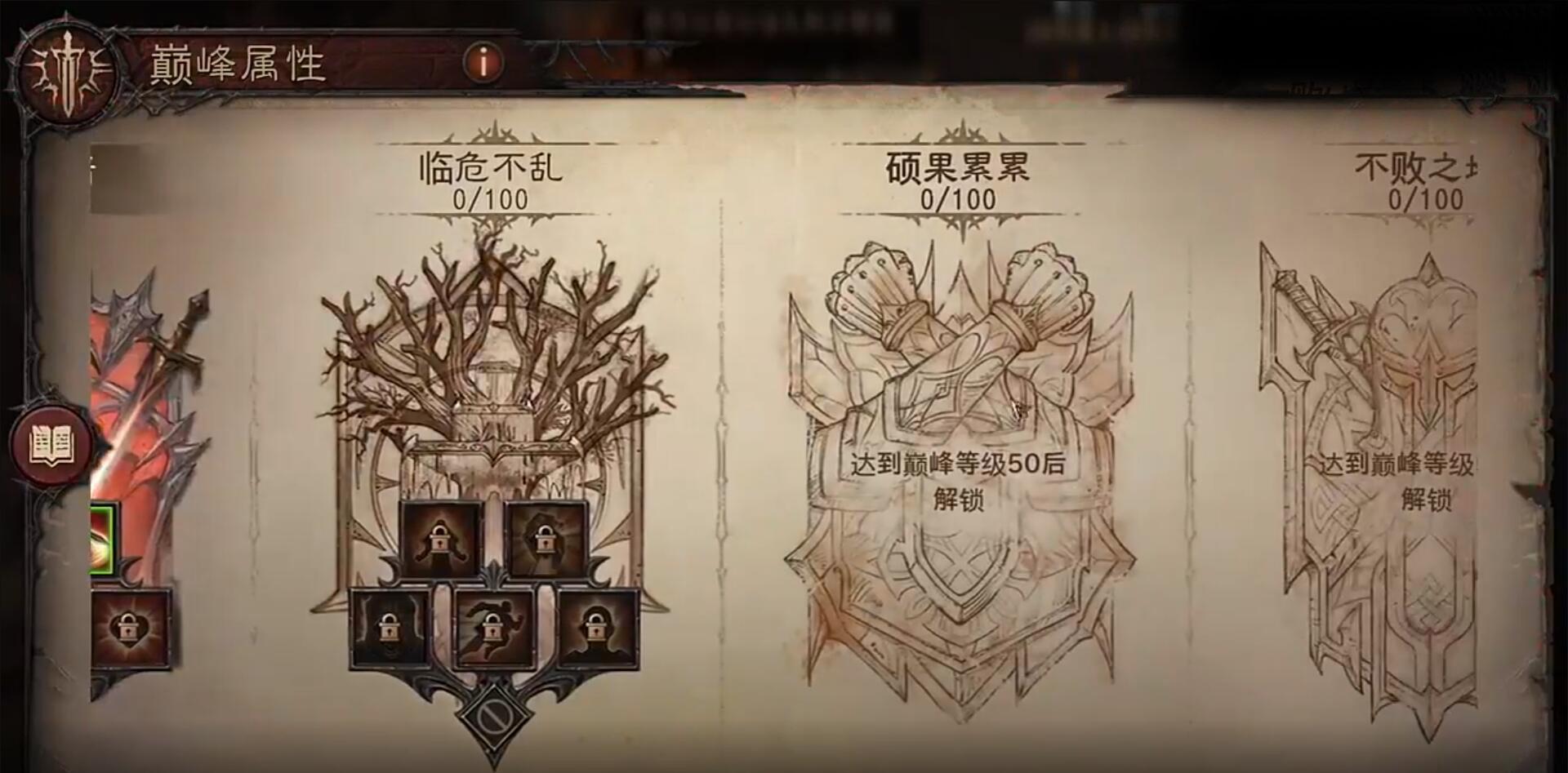 巅峰等级就是在人物角色等级满级后的另一套等级系统,巅峰等级的提升可以逐步解锁六套各有侧重的天赋树,这六套天赋树分布在巅峰等级1级/50级/100级解锁,解锁后用巅峰等级获得的技能点在天赋树立学习技能,天赋树中圆形技能都是对基础属性的加成,比如伤害+xxx、力量+xxx;方形技能则是属于技能特效类的,这些技能只有当该天赋树被勾选时生效(同一时间只能勾选一个天赋树)。