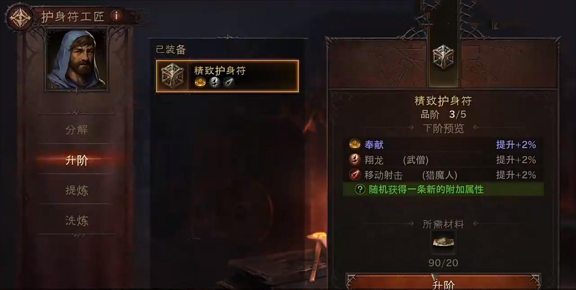 护符商人在主城里就能找到(鉴定商人边上),护符满阶是5阶。每升一阶就会多出一条技能加成。不过刷出的技能词条是随机的,而且不限于本职业,完全看脸。氪金大佬可以直接购买技能石。不过,好在护符词条提升的数值不高,所以对于0氪和微氪的玩家差别不大。