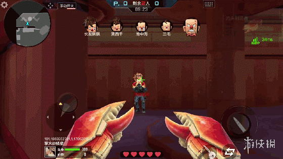 在该模式中原有的战斗方式也会有所改变,比如血量和武器方面。该模式不可以使用自己装备进背包的武器,只可以使用系统提供的武器。该武器为虾蟹的钳子,初始伤害并不高,攻击范围也较短,操作难度大。但随着击杀数的提升均会提升,而玩家的血量会提升为200,也就是说,想重击一击必杀的想法不再现实,可能轻击反而好用一些。