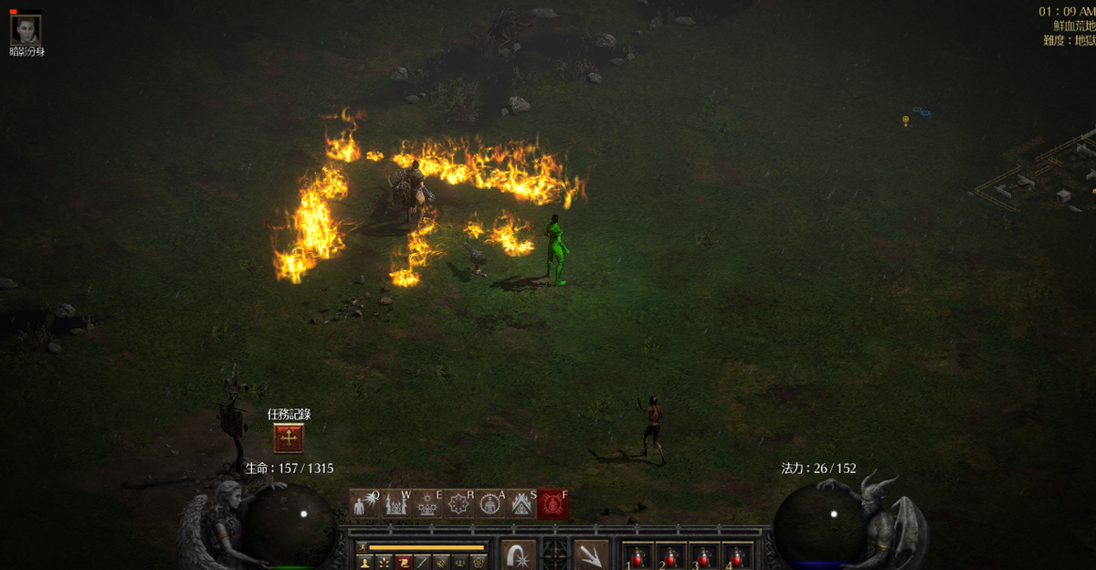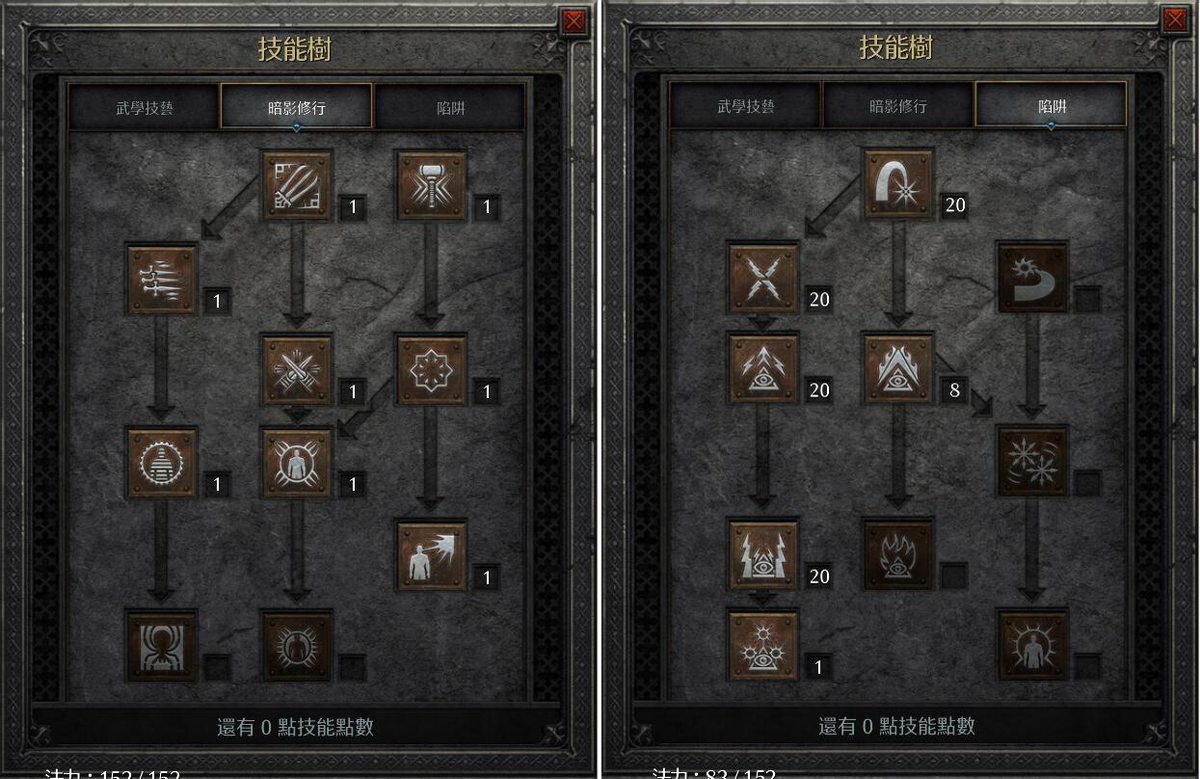 因此我们的技能加点就简单了,满五个技能:火焰轰击、雷电网、电能守卫、雷光守卫、焰痕卫哨。其中火系优先火焰轰击,开荒一路点下去不需要浪费阿卡拉的三次洗点机会。后期想转型成飞镖刺客或者武学刺客都非常容易。除了过路技能外,还需要一级影散、一级影子战士、一级心灵震爆。