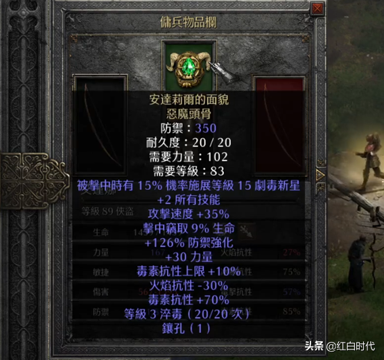 安头是安达利尔的面容,暗金的恶魔头盖骨,比较难出,这个头的好处是20%的攻速,可以镶个15%的攻速珠进去,让弓妹妹的攻速最大化。而且有吸血,有力量,绝对比物免头好用。2技能还能提高光环的等级,只不过缺点是-30%的火抗。不过雇佣兵本身的抗性也不低,如果实在担心,也可以镶个8号拉尔,把这30%的火抗给补回来。不过我觉得没必要,毕竟弓妹妹是站后排的,前面有女武神顶着呢。