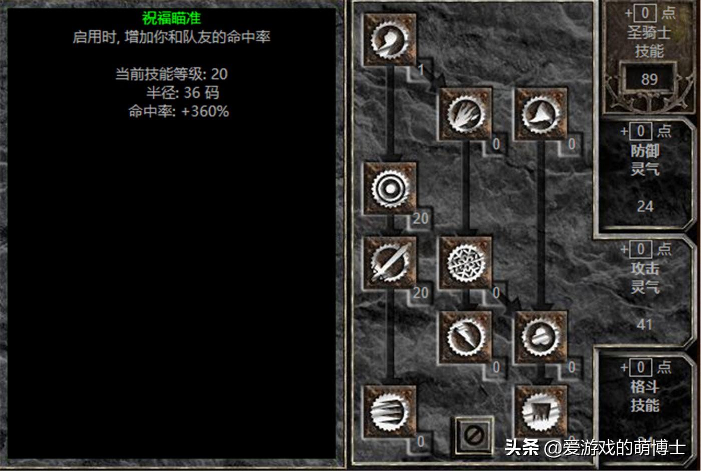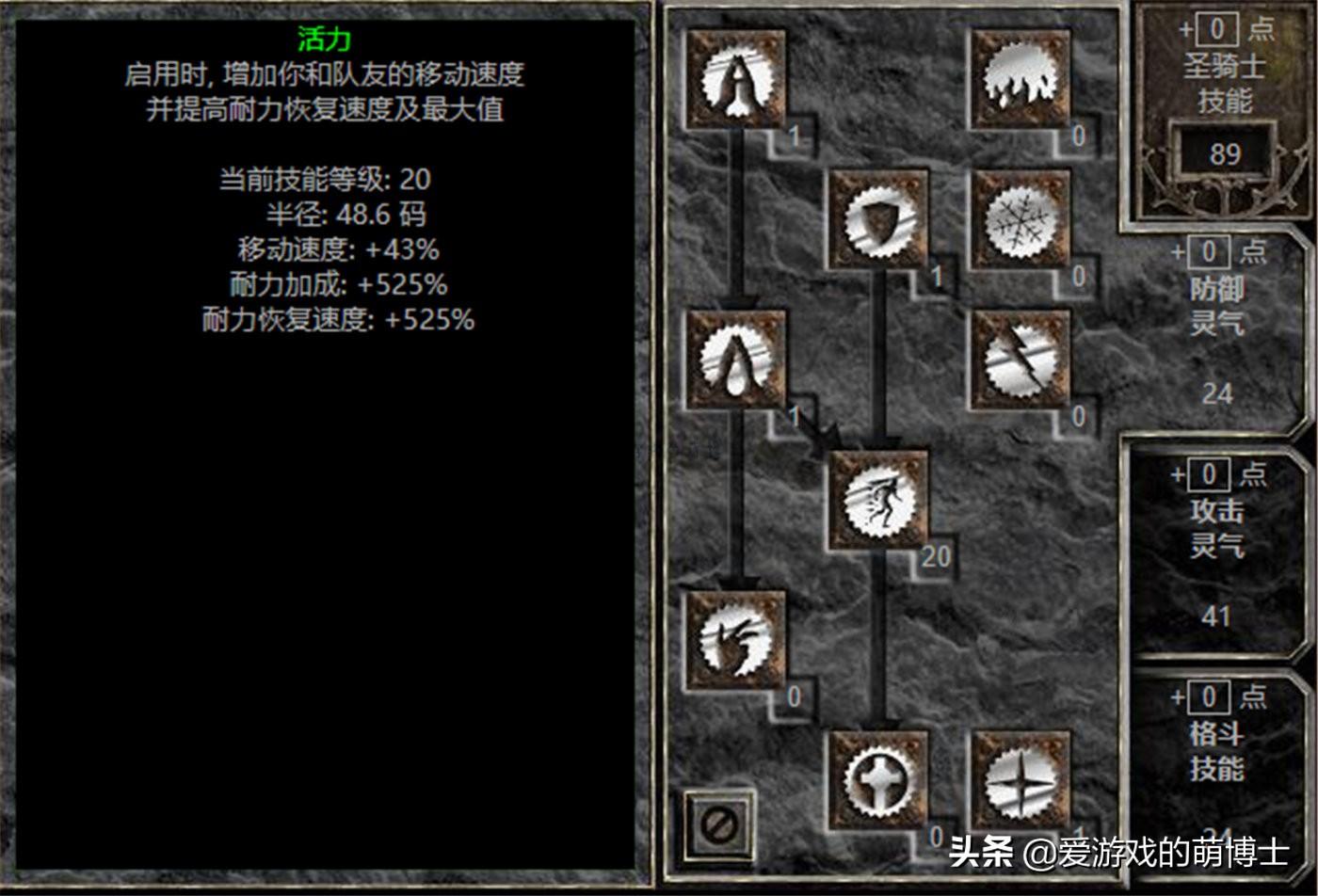 配点顺序方面,由于谜团符文组不是那么好获得的,所以你非要用圣骑士来拓荒的话,博士建议使用攻击灵气系的白热圣火丁起家,等到有了一定的等级,达到了一些装备的时候再改成祝福之槌流派。