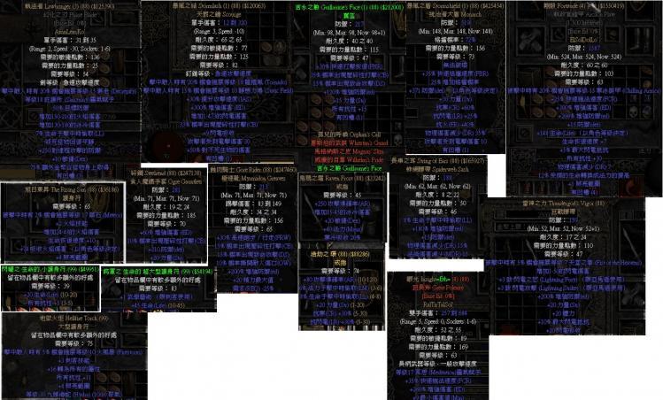 衣服首选攻击加成最高的刚毅,没刚毅可以考虑强制或者升级后的蛇魔法师之皮。其余装备都是日用品价格的装备,包括:幻化之刃执法者(为了攻速达标,出衰老和庇护所灵气,8人条件用)、暴风之结(为了在攻速达标的条件下提供尽量高的压碎打击,3人以下环境用)、吉永的脸(镶嵌 22#),旭日项链(混避难所条件专用,为了火怪群中防火),暴风之盾(镶嵌红宝石),碎钢手套(为了10%压碎和80%的伤害加成。龙爪不吃恶魔伤害,所以手掌安置的350%恶魔伤害没用,其他手套的伤害加成都不如碎钢。也可以用10cb类高属性+高电火抗手套,降低囊里抗性压力),乌鸦+双吸戒指,长耳串腰带(可以升级一下),雷神腰带(有电鬼出现的场景用),蚀肉骑士鞋(必须升级一下。也可以考虑直接用影舞者)。囊里刺客专用暗金护身符和1个武学技能护身符(保证24级龙爪的5连踢),4~10个5抗小护身符(看戒指条件)。囊里的武学护身符不用多,留多点空位捡东西,反正多一级的龙爪只是多7%的踢击伤害,只等于增加7点力量的加成效果。