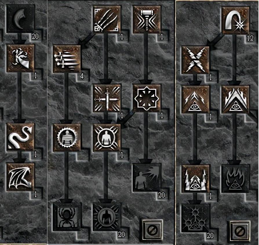 由于平民装的8人难度条件下,亡者陷阱的暴尸清场威力已经大大减弱,并且由于已经固定了龙爪和心灵震爆两种技能,技能点数已经无法兼修电陷阱,所以这里只能放弃电陷阱的投入,同时使用执法者和心灵震爆来给队友创造安全又高效的条件。其实在无法兼修的条件下,技能点充裕,剩余技能可以有很多选择,包括:电陷阱(亡者陷阱由1-454的电伤害变3-1380,还有4-2049的雷光陷阱),毒牙(每0.4秒545的毒),虎击(3虎击后的龙尾一击踢出约2320的物理加4176的爆炸火,不过在混沌避难所这里,就显得操作麻烦又低效),刃之守卫(用于触发衰老,不过伤害极低,并且在一边放心灵震爆一边慢慢找头目金怪的操作下,很安逸,无需刃之守卫触发衰老)以及刀刃之盾(颜值担当,就是为了好看,其伤害效果可以忽略)等,不过这些技能对这个速刷build都没多大效果,最终选定带多一个当沙包用的影子大师,也不靠它杀,只是拉多个人下水,起码怪物的攻击目标由2个变成3个。