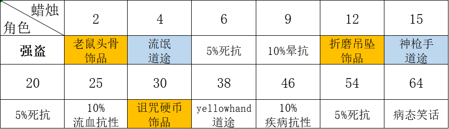 在9月底更新的新版本中,每个人物需要投入对应的蜡烛数量,才能解锁相应的抗性与专属饰品、道具、道途等内容。上图既是强盗作为初始人物,需要投入蜡烛后解锁的对应能力。