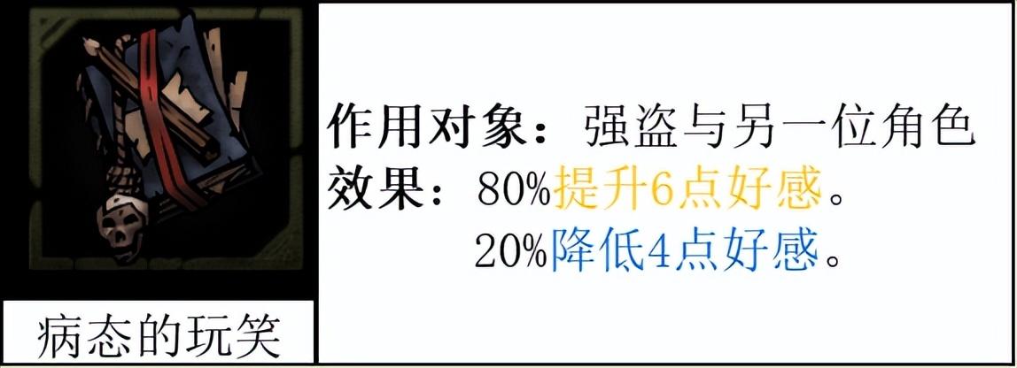 在强盗的蜡烛进度强化满之后,每次抵达小酒馆会有几率获得一个叫做“病态的玩笑”的酒馆物品。该物品可以用来改善或破坏掉强盗与其它任意一名队员的关系。