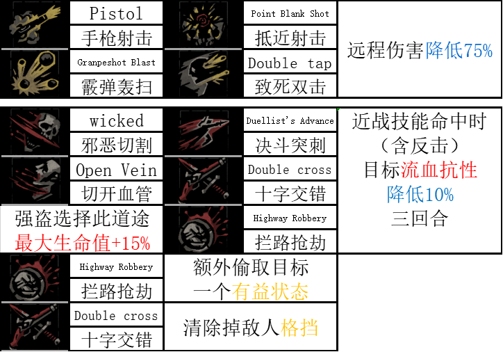 强盗人物特点是:瞄准提供的绝对暴击,邪恶切割、致死双击提供的终结死门敌人能力(最低降低到5%死门)。