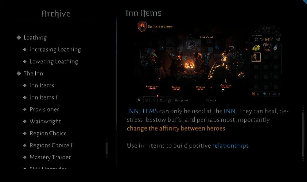 酒馆道具可以在酒馆的时候使用,他们可以治疗、解压、提供buff、以及最重要的是,玩家可以建立英雄们之间的好感,改变好感度,大部分这样的道具都有大概率改善二者关系,小概率使关系恶化。