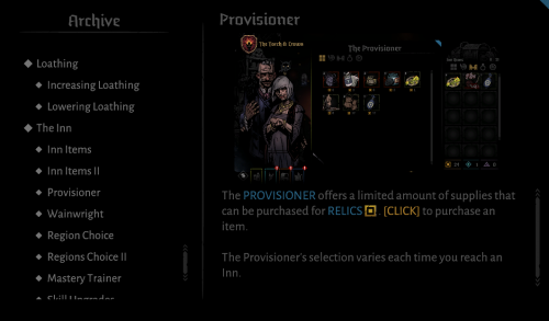 杂货商(酒馆页左下左数第二个按钮)提供有限的补给品,可以用遗物(金币)点击购买,并且当你进入一个酒馆时,他们的商品会变化。