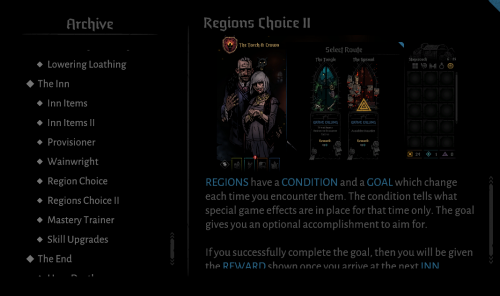 地区有会不断改变的一个条件以及一个目标,条件体现出在这个区域在这一次会有什么特殊效果产生,目标则给你一个额外的如果达成的奖励品。如果你成功完成了目标,你会在到达下一个酒馆时获得奖励。
