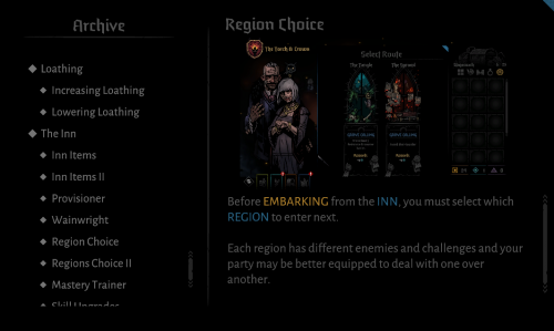 地区选择(酒馆页左下左数第五个按钮,也就是最右侧的按钮)是你在离开酒馆之前必须选择的。每个地区有不同的敌人和挑战,你的队伍应当准备充分来应对接二连三的挑战。