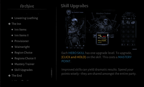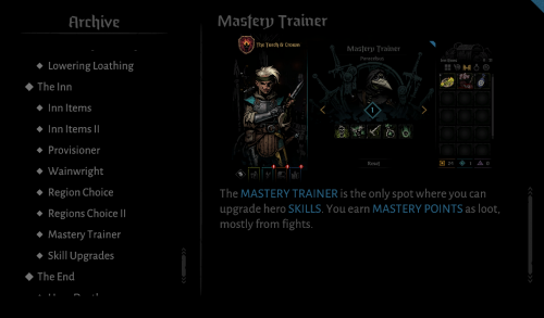 精通训练者(酒馆页左下左数第四个按钮,也就是右侧第二个按钮)是你唯一可以升级英雄技能的地方。你可以通过战斗获得技能点在这里使用。