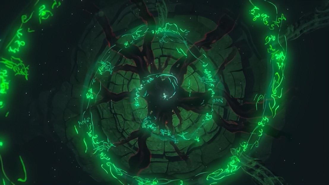 也许林克是先后被红色和绿色两种物体所附身,而绿色其实是为了压制暗红色的,是救了林克一命.....从下图中的这一幕也可以看出,绿色的光芒呈现出一种“捆绑”的结构,就像是对着林克的手臂进行了封印一样。