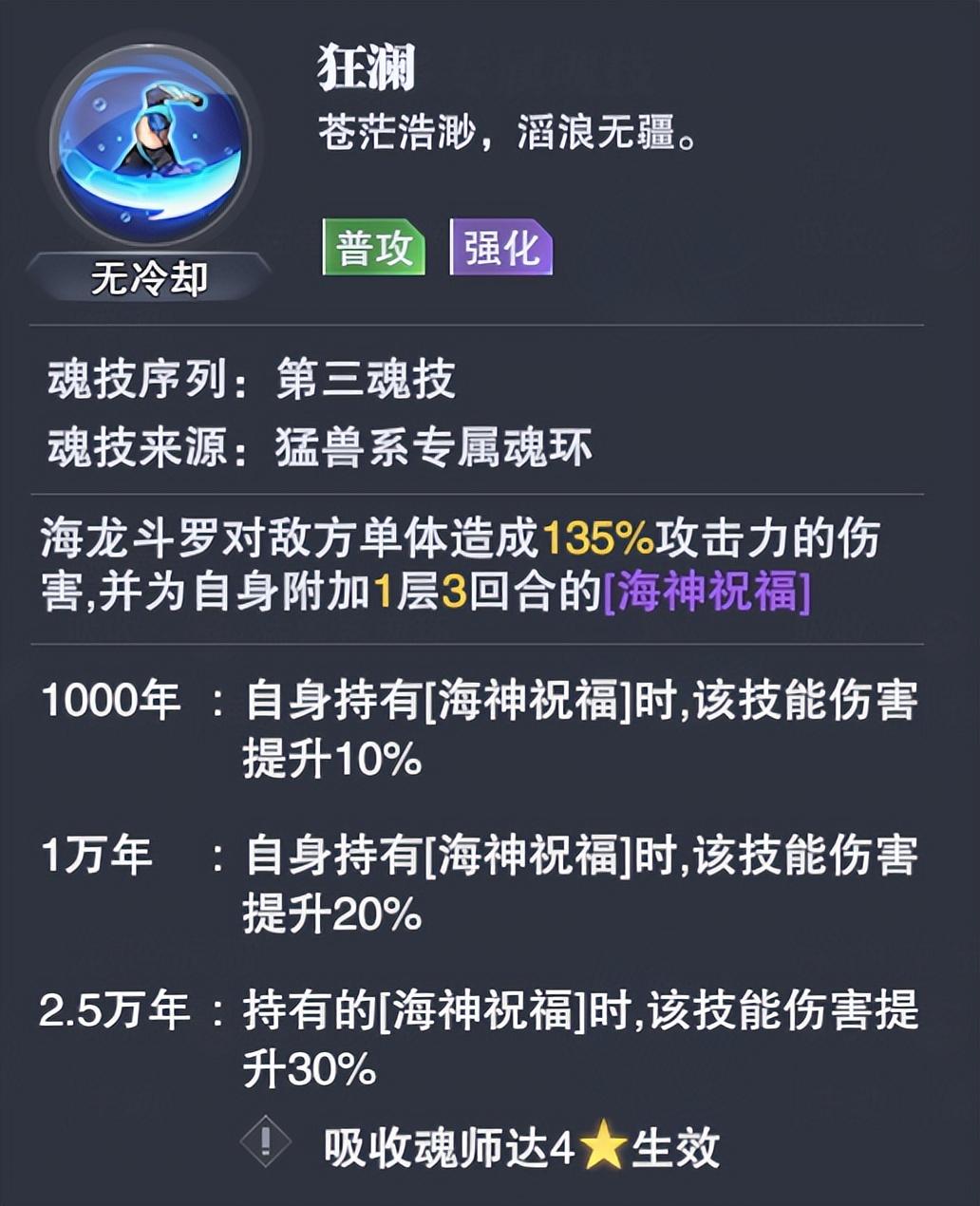接着海龙的3-1技能【狂澜】是一个可以为自身施加【海神祝福】效果的普攻,同时在自带【海神祝福】效果时,其伤害会有一定的提升。
