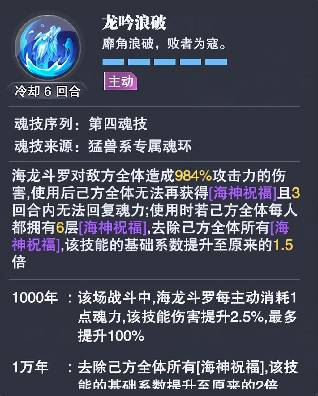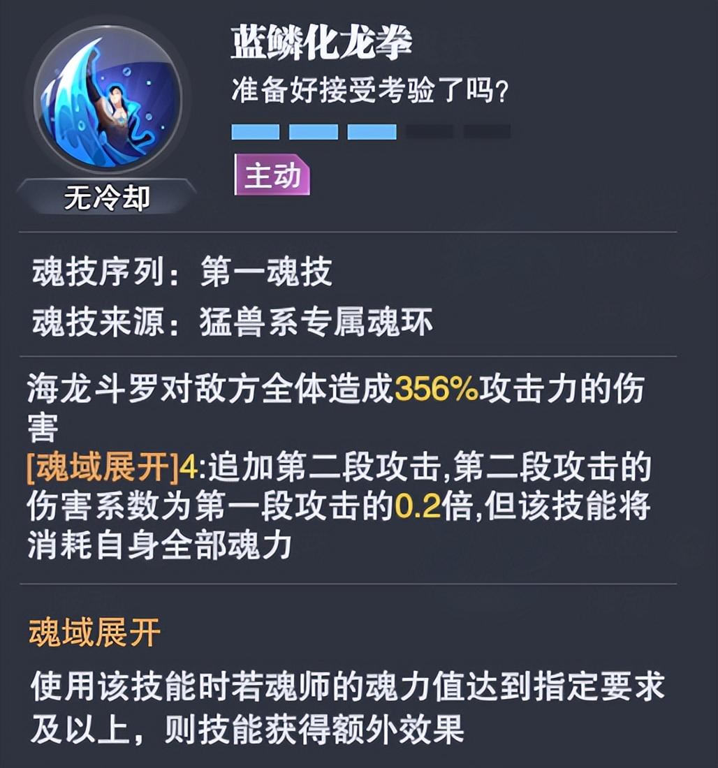 1-1技能【蓝鳞化龙拳】的核心作用是长图打伤害,特点是海龙的魂力越多,其附加的第二段伤害则越高,但此次伤害会消耗所有的魂力,因此海龙不仅要求其魂力上限要高(需要波赛西的【海神祝福】),还得需要每回合都能回复大量的魂力(需要小白的【海神圣谕】),这也是他为何被称为祝福流魂师的最大原因。
